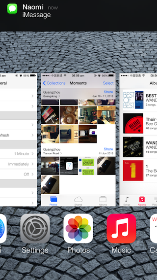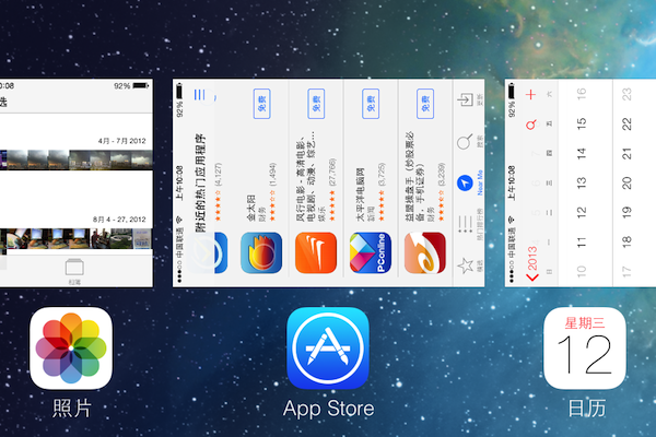 双击 Home 键,就会进入 iOS 7 的多任务管理界面。和 WWDC 上发布的一样,左右滑动可以查看后台正在运行的应用,或者是之前打开过的应用,应用界面的下方则是每个应用的图标;而按住代表着一个应用的界面然后再向上拨,则是在后台“杀掉”某个应用的进程。
