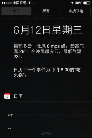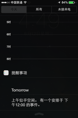 之前有人说通知中心无法显示天气,这是不对的。在“今天”的分类下,iOS 7 会准备好当天的摘要,让人迅速了解到今天的日期、天气状况、约会以及待办事项。这些信息都以一小段文字的形式出现,一眼扫过即可读完。
