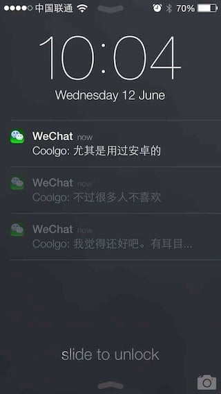 另外,现在锁屏界面所显示的推送通知中,第一条会自动点亮,并闪动,跟其它的消息区分开来。让用户知道最新一条的消息是什么。这也是能提高用户体验的细节。