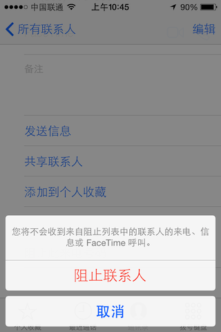 由于少了按钮、蓝色背景纹理,联系人的详细信息的页面显得比较清爽;在下方,新增“阻止此来电号码”——如果你觉得某个电话实在骚扰,可以把这人加入黑名单,将不再受到此人的来电、信息以及 FaceTime 呼叫。