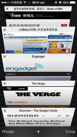Safari 变化很大,顶端的地址栏和搜索栏终于整合在一起,另外还增加了 3D 多标签页管理的方式——虽说样式上看,Safari 的和 Chrome 很相似,采用了 3D 的显示方式,标签页的内容变相拥有了更多的面积用于展示,方便我们寻找。