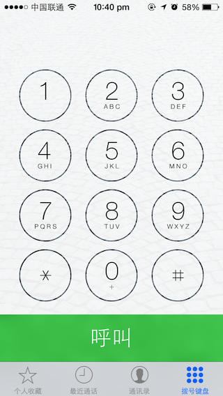 同样,iOS 7 的拨号界面也采用了“毛玻璃”的特效。如果按下数字键,你会发现,效果就好像在玻璃上挖了一个洞,直接看到壁纸。