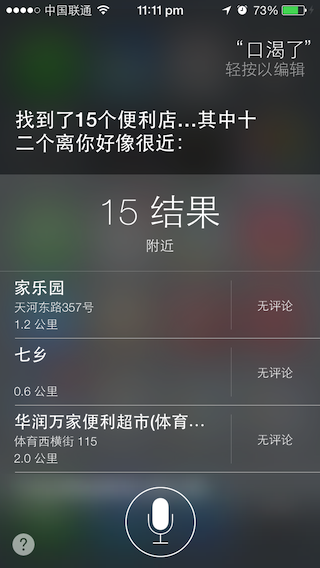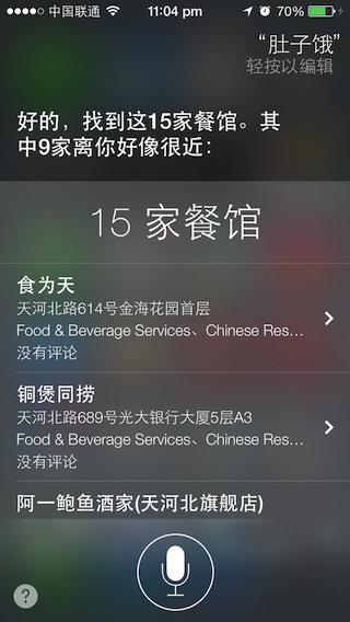 与 Siri 对话的过程当中,出现包含“星巴克”以及“天河城”的字样,仍然会让我们到网络查找相关的信息——但要知道“星巴克”已经是大众耳熟能详的咖啡厅,而“天河城”则是广州人必知的地方。显然,Siri 的本地信息不够完整。