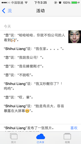 另外,现在的“照片流”多了一个“活动”,它能够显示你在“照片流”中分享了什么照片,以及引发怎样的回应。如此,“照片流”的社交属性得到了增强,有分享有回应。