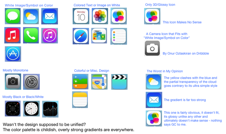iOS 7 的新图标需要打磨的,问题之一在于系统图标之间的风格并不统一。Quora 上,有人制作了这张图,把不同风格的图标进行归类:
