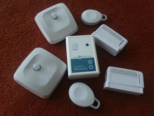 拆开包装,里面有一个 SmartThings Hub,它是一整套系统的心脏;其余还有六个传感器,分别能侦测运动、振动、温度以及东西的开或关。这一整套东西在商场里的报价是 400 美元(国内类似的东西应该不会那么贵),相关的应用目前只有 iOS 版本的。