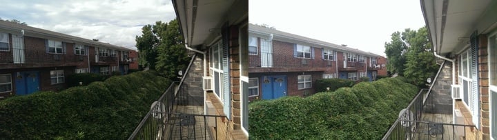 室外效果明显不同。定制系统 HTC One 能够捕获更多细节,植物、建筑、云彩层次分明。细节表现糟糕的原生系统在调整到自动曝光后,云彩细节得到恢复,但光线变暗,其他景物完全看不见。