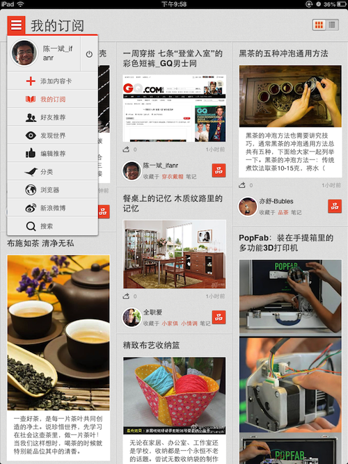 品读现在已经不再是笔记本应用的样子,更贴近“后 PC 时代的剪报本”的形态。我们可以将内容从网站或是品读本身的内容频道中摘下,收藏好,然后再分享给别人,使用起来有点像 Tumblr + Zite + 新浪微刊的合体。