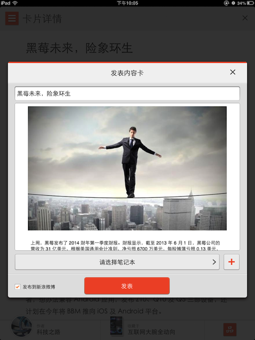我们还可以自行创建内容卡,可以做的事情包括创建标题,输入内容卡里面的内容,选择储存的笔记本,以及分享到新浪微博中。