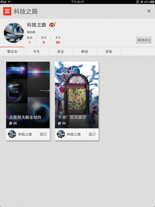 同时,我们也可以在品读上“关注”某些对一些话题特别关注的个人,追踪他们对某一话题的资料。在个人资料的界面,我们可以浏览对方所创建的笔记本,制作的内容卡,以及他的好友、粉丝以及关注。而直接点击名字左方的微博图标,则可以查看他的个人微博。