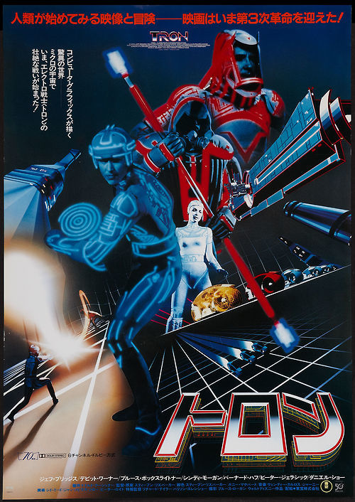 从 1982 年日本的科幻电影海报上,可以看到当时的人们为了表达未来感,将电路板化为演员身上所穿着的衣服。同时,当时 3D 技术不发达,唯虚幻的世界更代表无垠的空间。这些元素,仍然是当下科幻电影里重要的元素,只不过化为不同的意象。