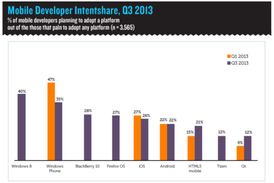 不过 Windows Phone 也不必蹲在墙角戳手指,因为有 35% 的开发者预备在今年第三季度投入到 Windows Phone 平台的开发工作当中去,而准备进军 iOS 的开发者则为 26%。也就是说,以后会更多的人愿意投入到 Windows Phone 的怀抱中去。这对于应用相对匮乏的 Windows Phone 平台来说是一个利好消息。