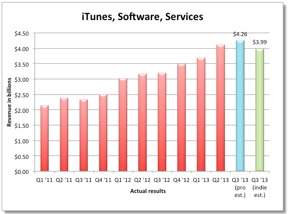 从分析师的预测结果来看,专业分析师对 iTunes 更看重一些,他们认为 iTunes 的增长会达到 33%,而业余分析师的预测则为 25%。