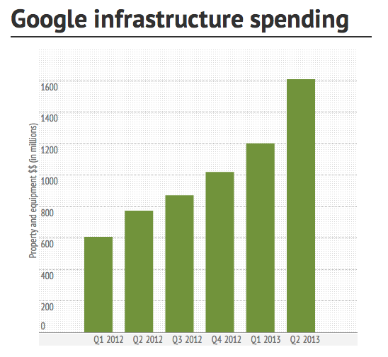 虽然在我们的潜意识里,Google 作为互联网企业的形象多一些,但是它在基础网络建设方面的作为也有点儿出乎意料,就在前不久,Google 还有一个看起来异想天开的气球上的网络计划。根据 Google 与微软的最新财报,两家公司分别在今年二季度投入 16.1 亿美元和 17.9 亿美元搞基础设施建设,主要服务器方面的支出,在这方面,Google 和 微软的差距已经不大了。