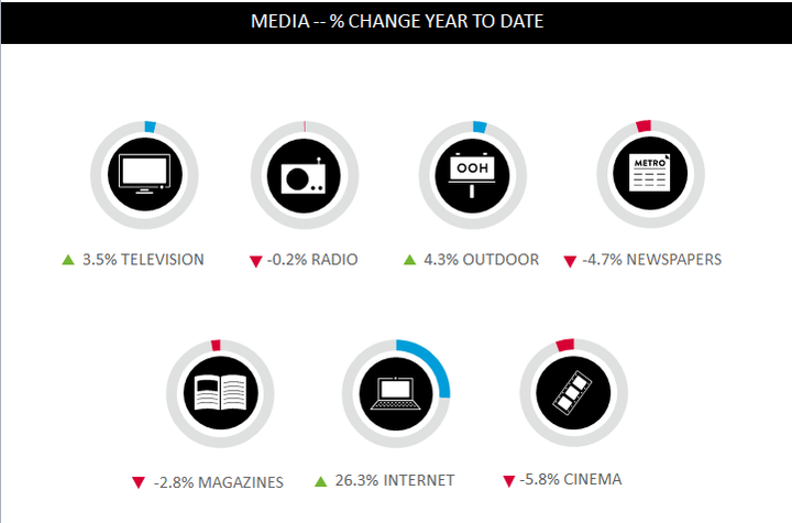 根据尼尔森的数据,在上述广告平台中,电视和户外广告是常青树,而广播、报纸、杂志和电影则渐渐无力了,但是最有潜力增长最快的当属互联网广告,在互联网广告里,移动广告随着移动浪潮的到来显得越发重要。