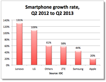根据 IDC 的数据,今年二季度增速最快的不是三星和苹果,而是较小体量的赶超者:联想,LG,“其他”,中兴,阿尔卡特等。三星的增幅只有 44%,苹果则只有 20%。其中联想和 LG 智能手机销量均翻番,实现爆发式增长。