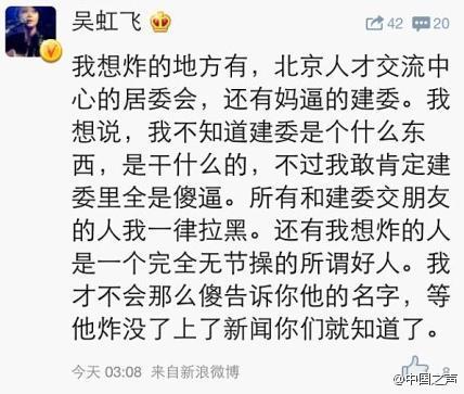 无独有偶,前几日我国一个较知名的歌手吴虹飞也犯了同样的事,甚至更严重。她在新浪微博上发了一条戾气十足扬言要炸掉建委的微博。