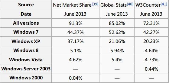 此图来自维基百科,可以看到尽管已经过去 11 年,Windows XP 仍然占据可观的市场份额