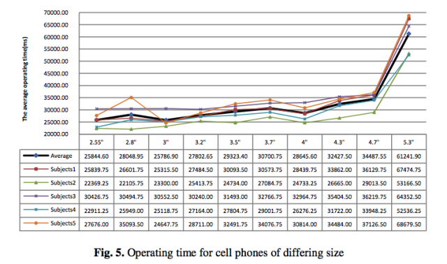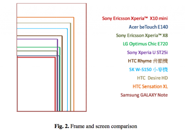 在此有一个Ars Tecknica 报道了一个小实验,实验者选取了 10 个不同屏幕尺寸的 Android 手机,这些手机的屏幕由索尼爱立信的 Xperia X10 Mini 的 2.55 英寸到三星 Note 的 5.3 英寸不等,并邀请被测试者在不同屏幕尺寸的手机上完成一个应用测试。该应用需要被测试者在不同的模式下去触摸屏幕不同的位置,并记录完成时间。