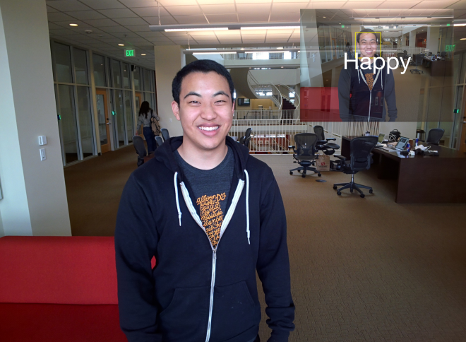 当你目光游离,不愿面对对方的微笑时,Google Glass 会帮你读出对方的表情和情绪,显示出“高兴”,当对方的眼睛睁大,嘴巴张开时,Google Glass 的屏幕上则显示也会随之改变,“惊讶”。