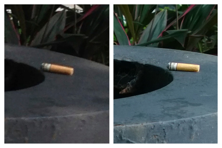 另外在较暗淡的环境下,拥有大光圈+大感光元件的 Lumia 1020 就更尽优势。画面非常明亮养眼,且拥有更多细节,同时因为高分辨率的关系,连垃圾桶上的烟蒂也清晰可见。