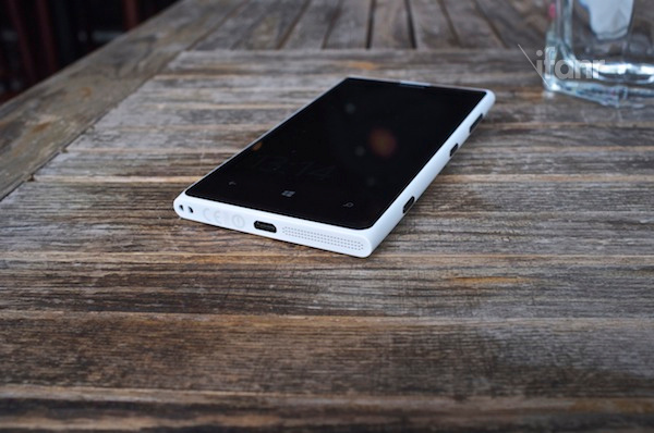 设计方面,机身四周一如既往简洁,所有功能按键被安置在右侧,如音量键、电源键,以及一个独立的双键程快门(手感一般)。耳机插口与 MicroUSB 接口分别处于顶部和底部。难能可贵的是,诺基亚依然在底部预留了一个挂饰孔。