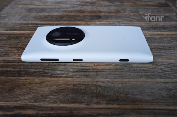 代表性的聚碳酸酯一体成型机身给人的印象有加分,整个机身几乎找不到缝隙,可以说诺基亚的这部旗舰质量还是非常不错的。即使用力敲手机背面,也完全没有同门 Lumia 820 那种松垮垮的感觉。另外一点也很重要,背面除了突出的“奥利奥”镜头外,一体成型机身让 Lumia 1020 的外观保持简洁,整机线条顺滑流畅,结合磨砂工艺外壳,触感非常的好。