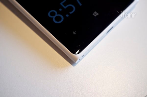 机器正面则没有任何惊喜,与以往 Lumia 相差不大,唯独听筒的位置较 920 有一点改变。另外得益于 AMOLED 自发黑的特性,则让屏幕与边框完全融合,从而能掩盖 Lumia 1020 边框较宽的缺点。