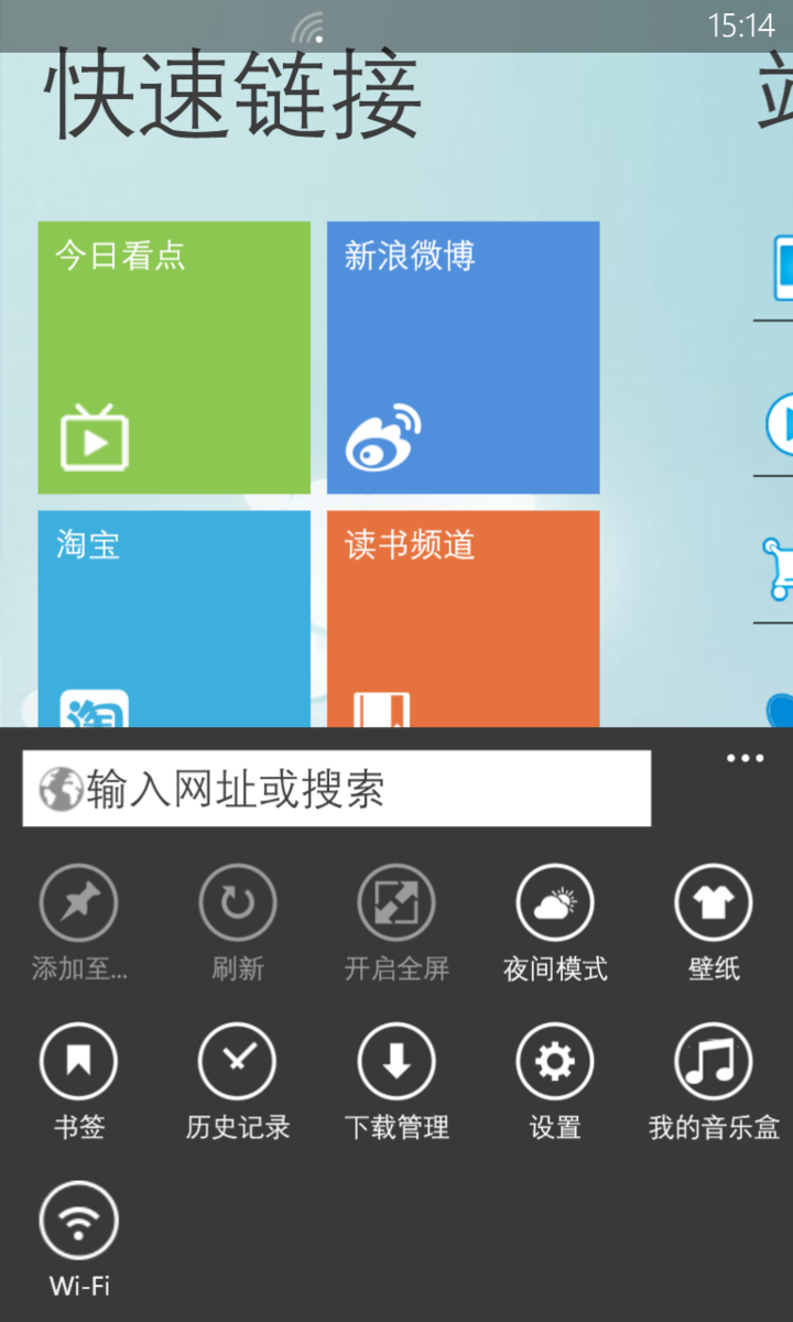 特别一提是 Lumia 自带的诺基亚浏览器,无论是起始页上的网址推荐、还是按键排布、以及提供的各种快捷键,都看得出诺基亚的用心。这款浏览器加入更多功能,如下载管理、夜间功能、WiFi快接方式,还有为单手操控而设计的标签切换、手势支持,让使用起来体验远超原生的 IE。