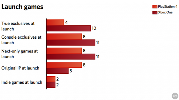 首先目前 PS4 和 Xbox One 已公布的游戏数分别为 79 款与 55 款,当中跨平台作品数量 32 款。而首发游戏上两方更加贴近,其中超过一半游戏将会同时在两个平台上发行。(注:ars technica 数据显示 PS4 首发只有 22 款,但其他媒体如 IGN 等均查证是 23 款,特此注明)