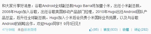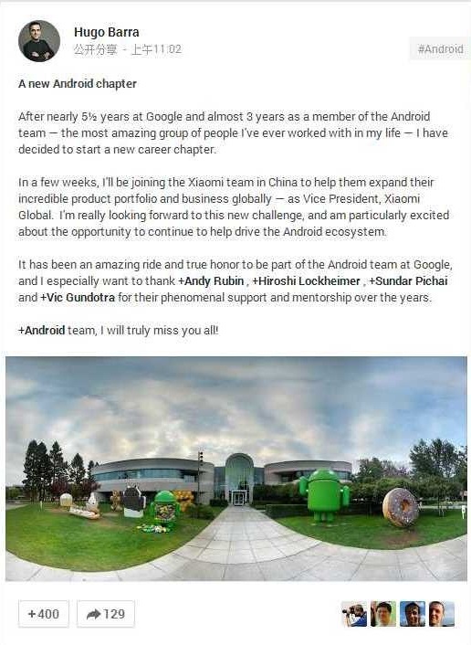 Hugo Barra 也在个人 Google+ 页面上公开了自己的离职,在表达完对 Google 和 Android 的谢意后确认加入小米。