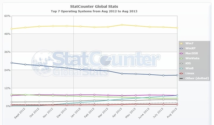 那么,抛却 Net Application 一家的统计数据,来看看 StatCounter 的数据,Windows 8 占有率从 7 月的 6.61 %,上升到了 8 月的 7.04 %。这种平缓的变化或许才是真实的状况。