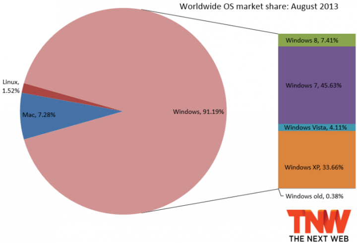 根据市场研究公司 Net Application 的数据,今年 8 月份,Windows 8 的占有率在一个月间的增长幅度达到了 2.01%,由 7 月的 5.4% 增长到了 7.41%。另一方面,Windows 7 收复了 1.14% 的失地,从 44.49%的占有率上升到了 45.63%,依旧牢牢占据着头把交椅。