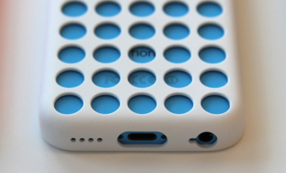 所以关于 iPhone 5c 的使用感受,大家都没有特别要说的,参照 iPhone 5 就好了。跟 iPhone 5c 配套的也有硅胶保护套,后面挖出的圆形孔洞则被调侃成 Crocs 洞洞鞋。 不过可以明显看到加上保护套之后的 5c 会比较厚。