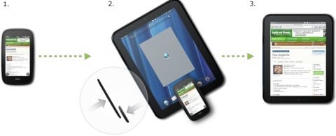 还记得惠普(HP)发布会中的 Touch2Share 技术吗?场景是:你在路上用 Pre 3 看一篇长文,回到家后用 Pre 3 轻触一下 TouchPad ,当前浏览的网页就会自动出现在 TouchPad 上,webOS 手机与平板成为一个整体。