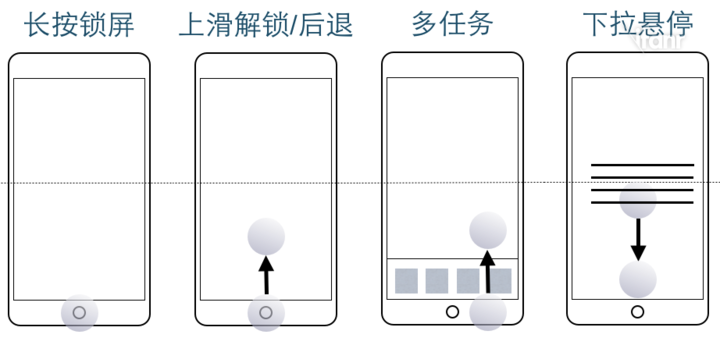 这张图里面,半透明的圆形代表着手机操作中的点或按,箭头表示滑动方向。其实有的交互并不新,比如说“长按 Home 键锁屏”,MX2 的时候就已经存在。不过,在 Flyme 3.0 之下,与“Home 键上滑解锁”相搭配之后,使用习惯马上就能建立。