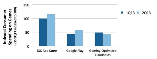 用户基础是有的。今年 5 月,IDC 和 App Annie 发布报告:2013 年第一季度,消费者在苹果 App Store 上的游戏花费首次超过他们在任天堂和索尼游戏掌机上的支出;今年 8 月,这两家公司再次发布报告:2013 年第二季度,消费者在 Google Play 上的游戏花费也超过了超过他们在任天堂和索尼游戏掌机上的支出,不过仍被 iOS 平台远远甩在身后。