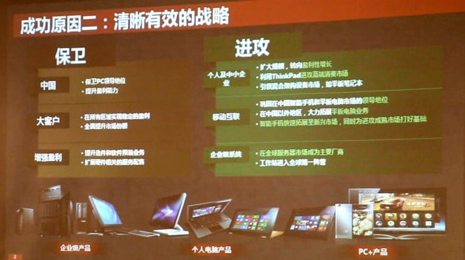 联想副总裁陈旭东曾用图说明,联想的战略分为“保卫”和“进攻”两端。当下 PC 业务已经放在“保卫”一端,个人及中小企业、移动互联和企业级系统则是联想未来的进攻方。