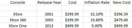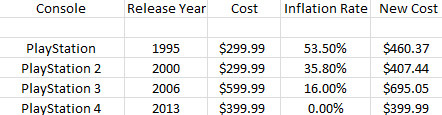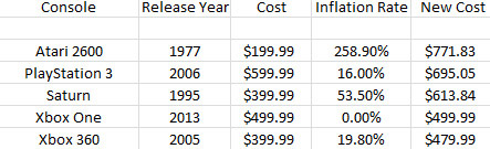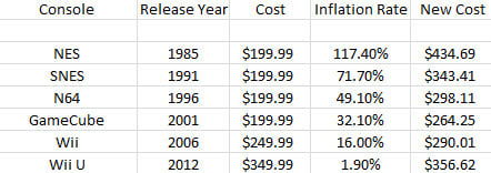 于 1985 年在美国发售第一部游戏主机 NES(俗称红白机),当时售价为 199.99 美元,而通过 117.4% 的通胀率换算,这笔钱在 2013 年相当于 434.69 美元。没错,比下月发售的 PS4 还贵。