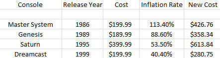 例外的,是 1995 年土星(Saturn)高达 399.99 美元的定价,为公司的衰败埋下伏笔。399.99 美元与今年的 PS4 一样,但在 1995 年,这个价位相当于 613.84 美元,并不比当年的 PS3 便宜多少。但相对比其便宜 100 美元的索尼 PlayStation,土星在关键的 3D 图像性能上表现却差了一大截。