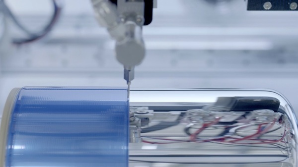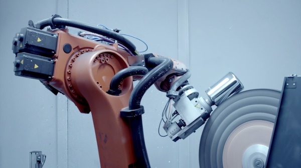 除了 Mac Pro 的机壳外,苹果还用 Guyson 自动喷砂柜来处理 Mac Pro 中心的冷却塔。而位于图片中间的是 FANUC 所生产的机械臂。
