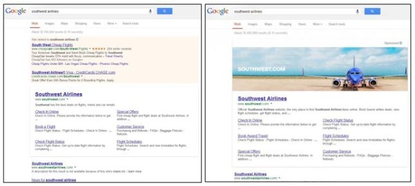 而目前,Google 正在测试新的广告形式,在搜索结果的顶端展示巨大的横幅广告(banner ads),如果没有装上广告屏蔽插件,可能有一些用户已经看到这一变化了。下面是来自 Searchengine Land 的对比截图: