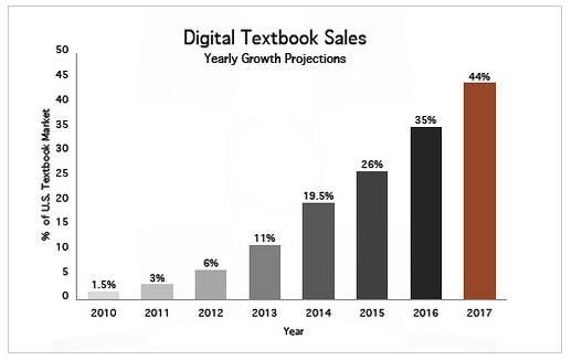 随着电子阅读设备的技术不断完善,从亚马逊 Kindle 平台到 Barnes & Noble 瞄准学生市场的 Nook,都看中了这块蛋糕。电子教科书目前在教科书总销售中所占比例还很小,不过从在线学习互助网站 Xplana 的最新报告来看,它也许正面临增长的爆发点,他们预计,在未来 5 年内 25% 的高等教育及职业教科书会电子化,销售在未来四年内会增长 80% 到 100%。