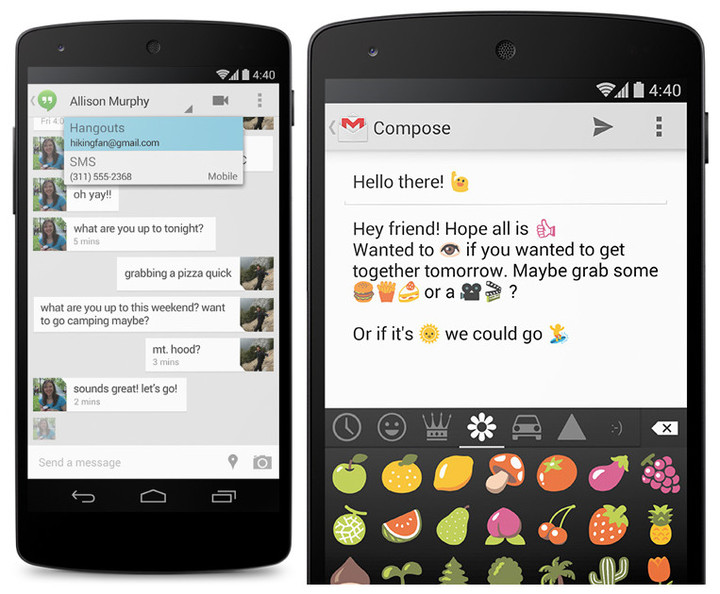 这次 Android 4.4 把信息功能直接集成到了 Hangouts 之中,这样就省去了切换的麻烦,也将使得这个新的信息应用更强大功能更多样,可以进行网络语音和视频呼叫。此外,Google 原生的键盘中集成了许多的绘文字(Emoji),并支持日文输入。