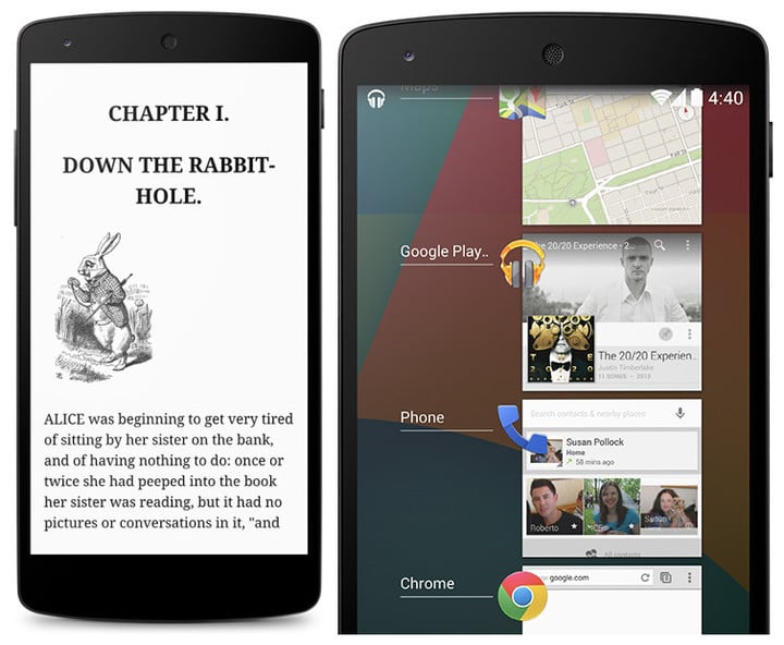 原来那条黑乎乎的系统虚拟按键终于可以消失了,在阅读、游戏或者播放电影的时候,可以切换模式自动隐藏虚拟按键栏和顶部状态栏,需要使用的时候只需要滑动屏幕边缘即可唤出。另一方面,在多任务界面也进行了改进,优化了内存和屏幕适应,所以理论上来说 Android 4.4 会更快更灵敏。