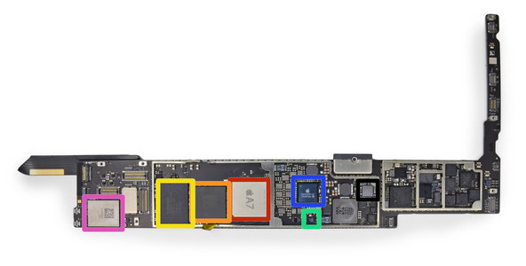 这里就是 iPad Air 最核心的地方了,最显眼的就是 A7 处理器,型号为 APL5698,和 iPhone 5s 的 APL0698 A7 处理器在频率上略有不同。A7 处理器隔壁的橙色框指示的是 Elpida F8164A1MD 1 GB LPDDR3 的内存元件,黄色框内则是东芝 THGBX2G7B2JLA01 16 GB 闪存记忆体,也就是内置存储。