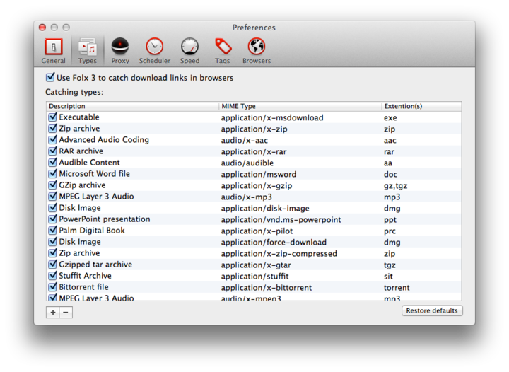 偏好设置中可以选择你所希望用 Folx 来下载的文件类型。不过在实际使用中,Folx 3 对一些“不规则”的下载链接没有太多办法,有时需要手动添加下载链接。