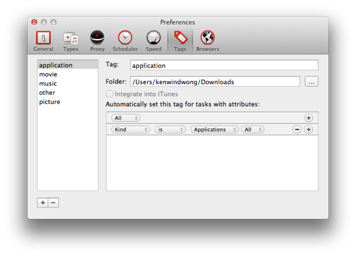 Folx 所做的更进一步。你可以为下载任务设定标签规则,比如文件后缀为 .mp3 的下载文件自动打上 music 标签,并放入 downloads/music 文件夹,还可以直接加入 iTunes 的播放列表(即 iTunes 整合功能)。当然,在添加下载任务的时候,你也可以手动添加标签。