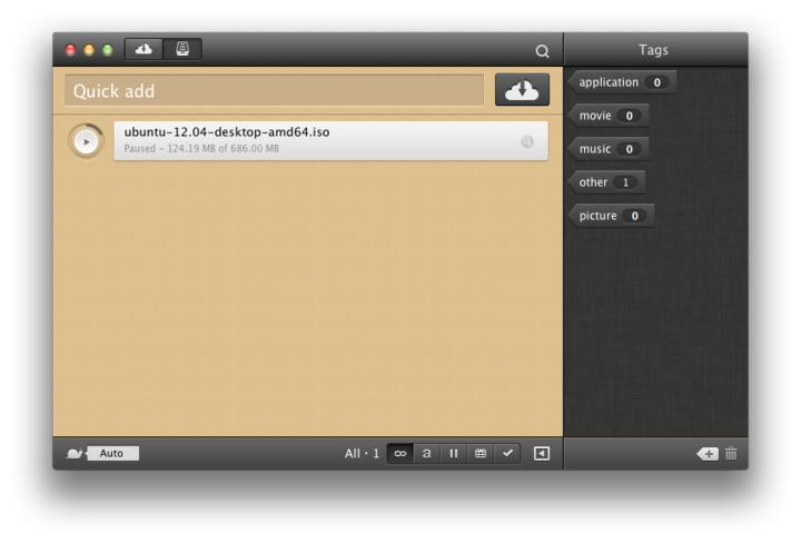 Folx 3 在用户界面进行了极大简化,主要分为下载列表区和 Tag 区。底部按钮可用于限速以及过滤不同状态的下载任务,开始/暂停/恢复 按钮被直接整合进下载列表里。