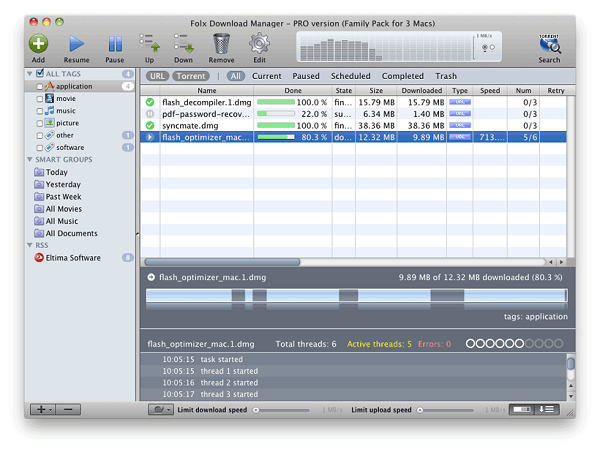 Folx 3 的免费版本最多支持 2 线程,而 Pro 版本最高支持 10 线程。从下载速度来看,Folx 3 的表现令人非常满意,在电信 8M 宽带情况下大多数时间都能达到满速。这一优点在此前就被许多用户饱加赞赏,选择用 Folx 来下载较为大型的文件尤为适合。